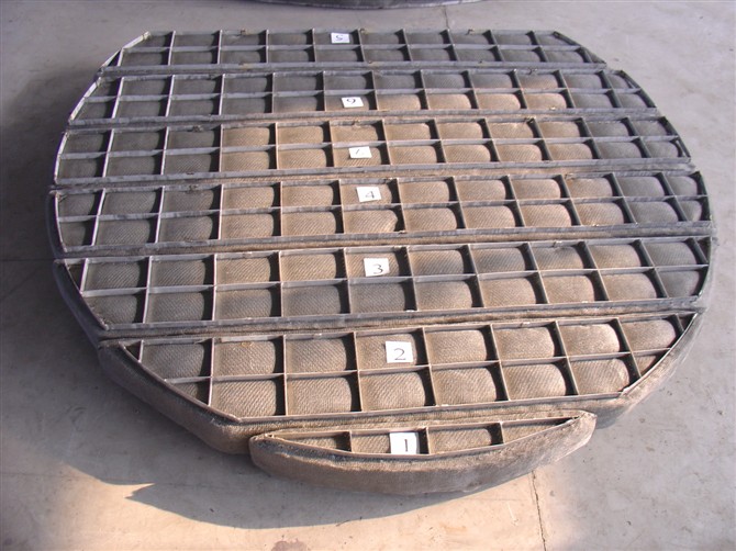 絲網除沫器一般都是放在塔內的頂部,確保塔頂餾出產品的質量。當時運用的除沫器有折板形、絲網形和旋流式,其作用是分別塔頂氣體中夾藏的液滴,其間以絲網除沫器運用最為廣泛,它將許多層絲網用柵板夾住,并用螺栓固定在支撐圈上,對大直徑的塔,絲網也可做成分塊式。絲網用圓絲或扁絲織造而成,資料多用不銹鋼、磷青銅、鍍鋅鐵絲、聚四氟乙烯、尼龍等。